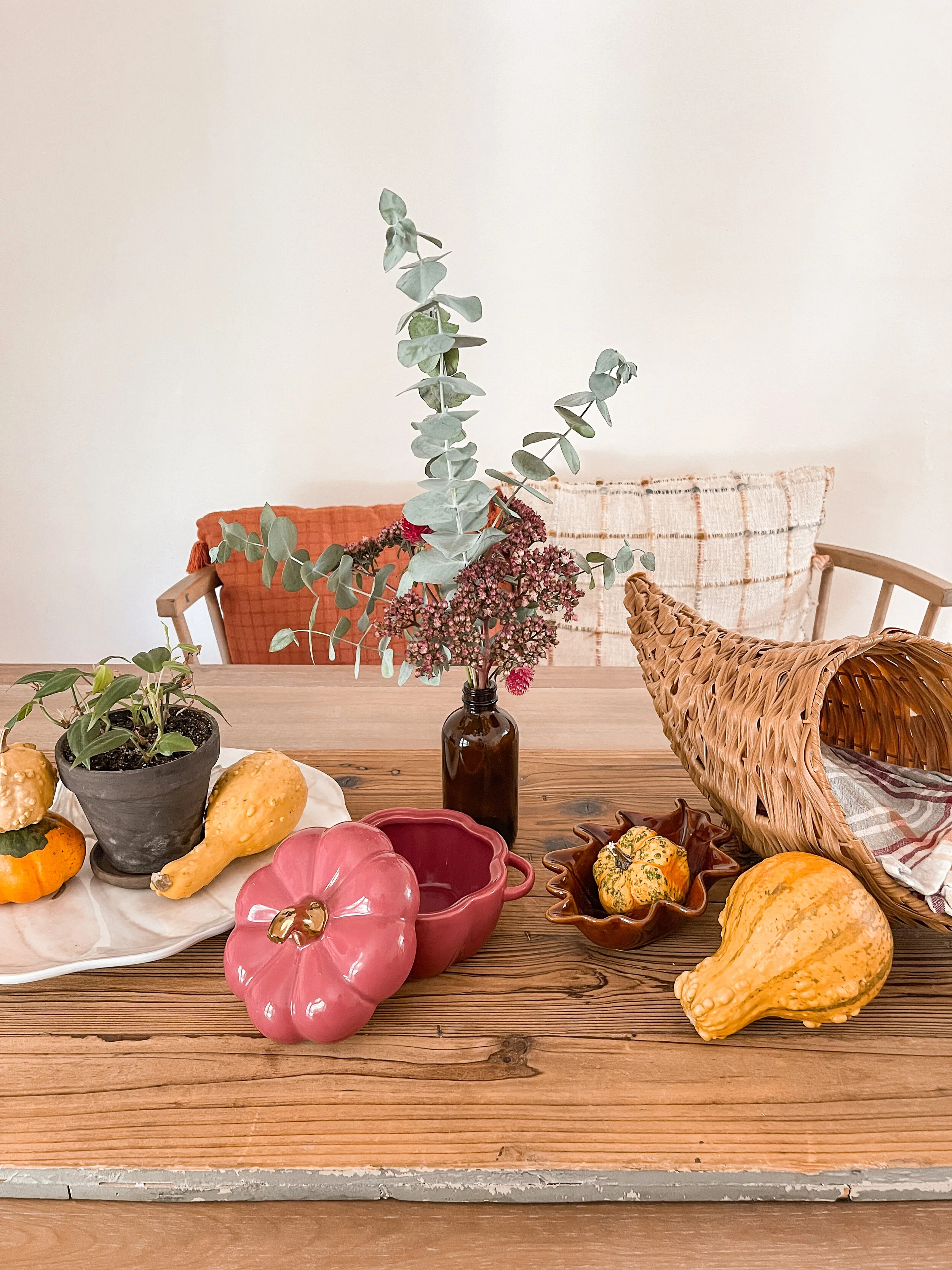 I also layered in a pumpkin tureen, a leaf shaped bowl, and more gourds.
