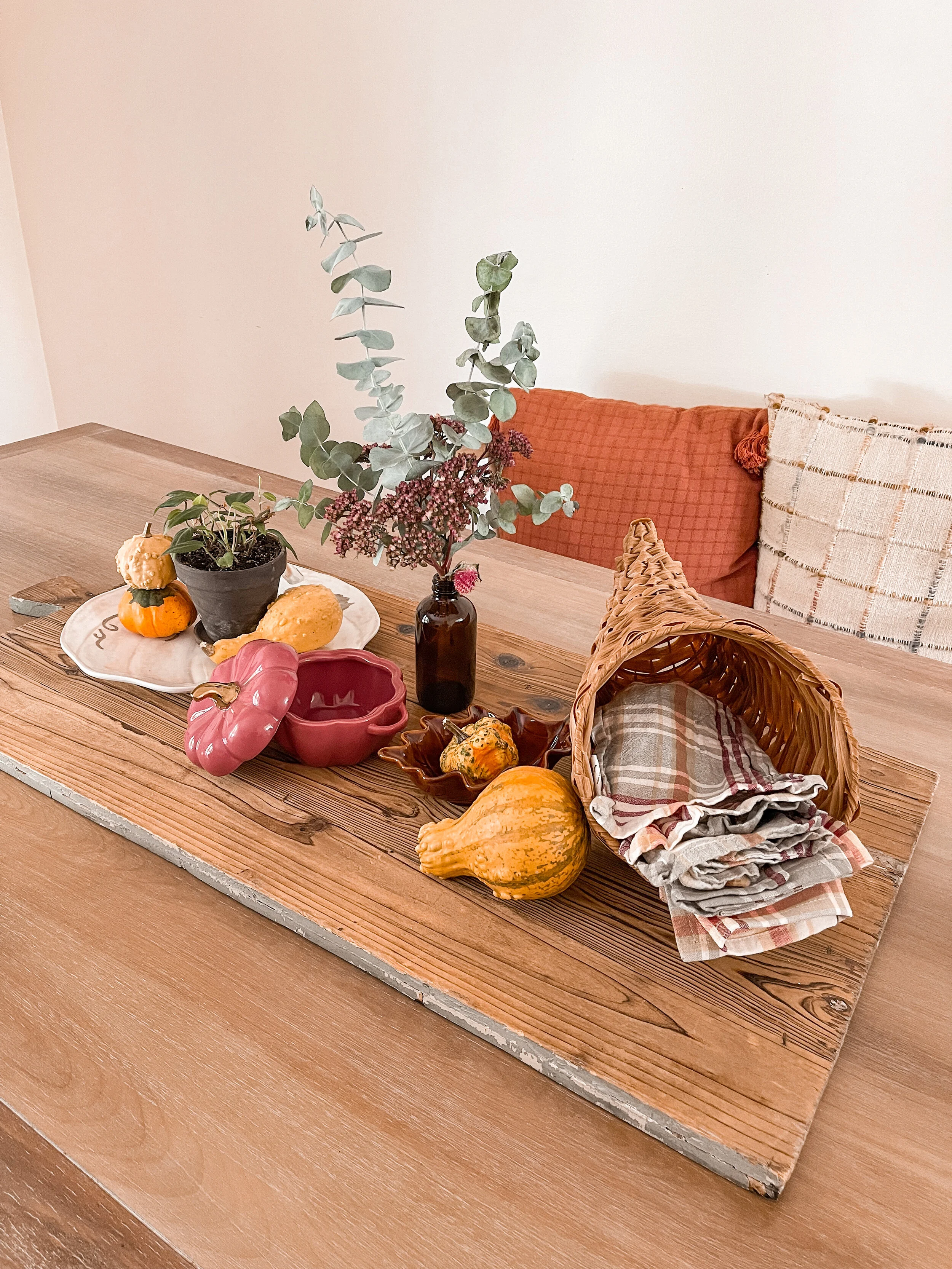 On the right, I put a cornucopia basket and filled it with seasonally themed napkins. Easy to grab when eating meals!