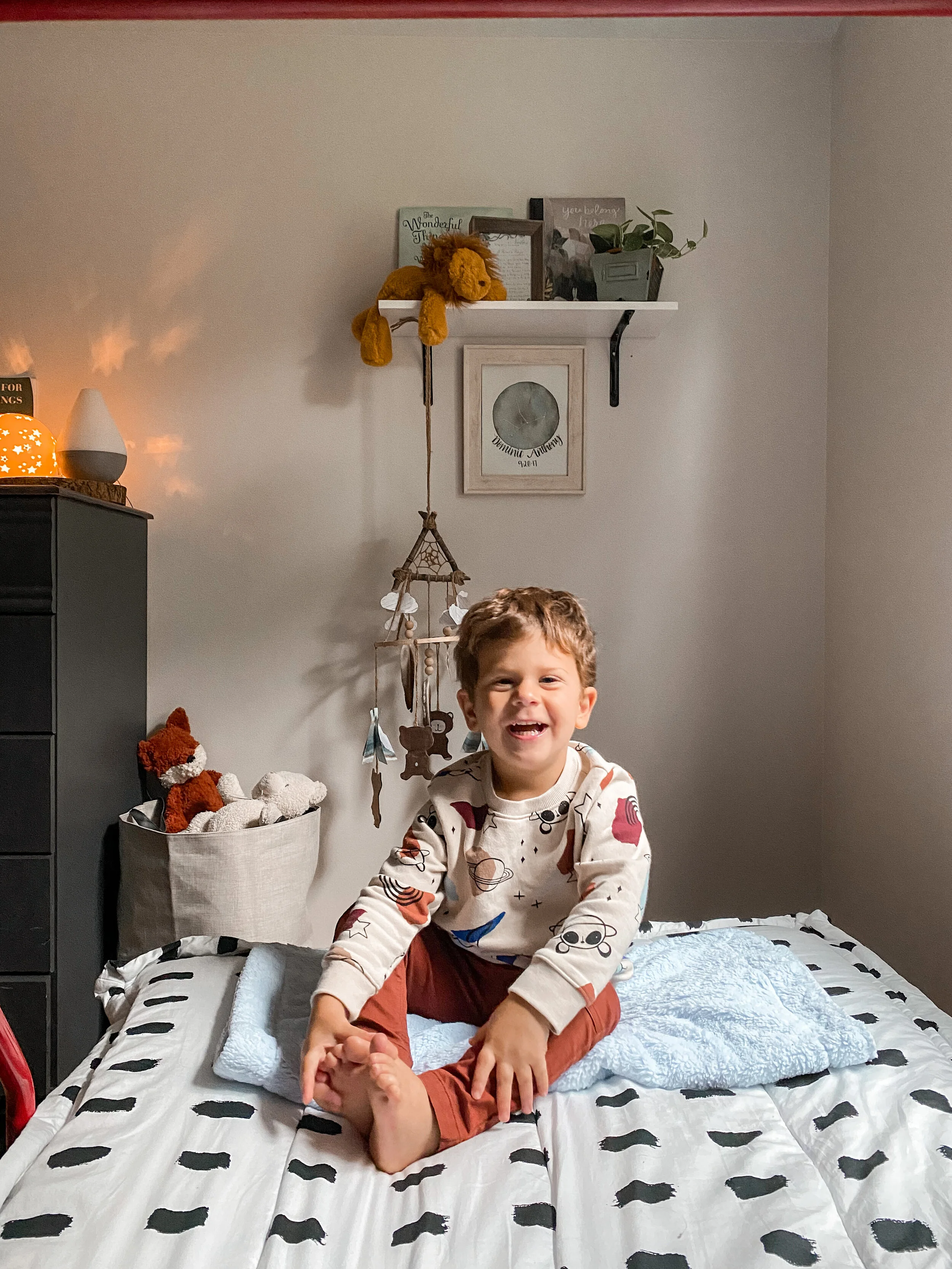 This floating shelf was so fun to put up and I think it’s perfect for this wall in Dominic’s room. It was a big bare wall and this shelf is perfect for taking up some space. I also love that it cleared up some space on his dresser.