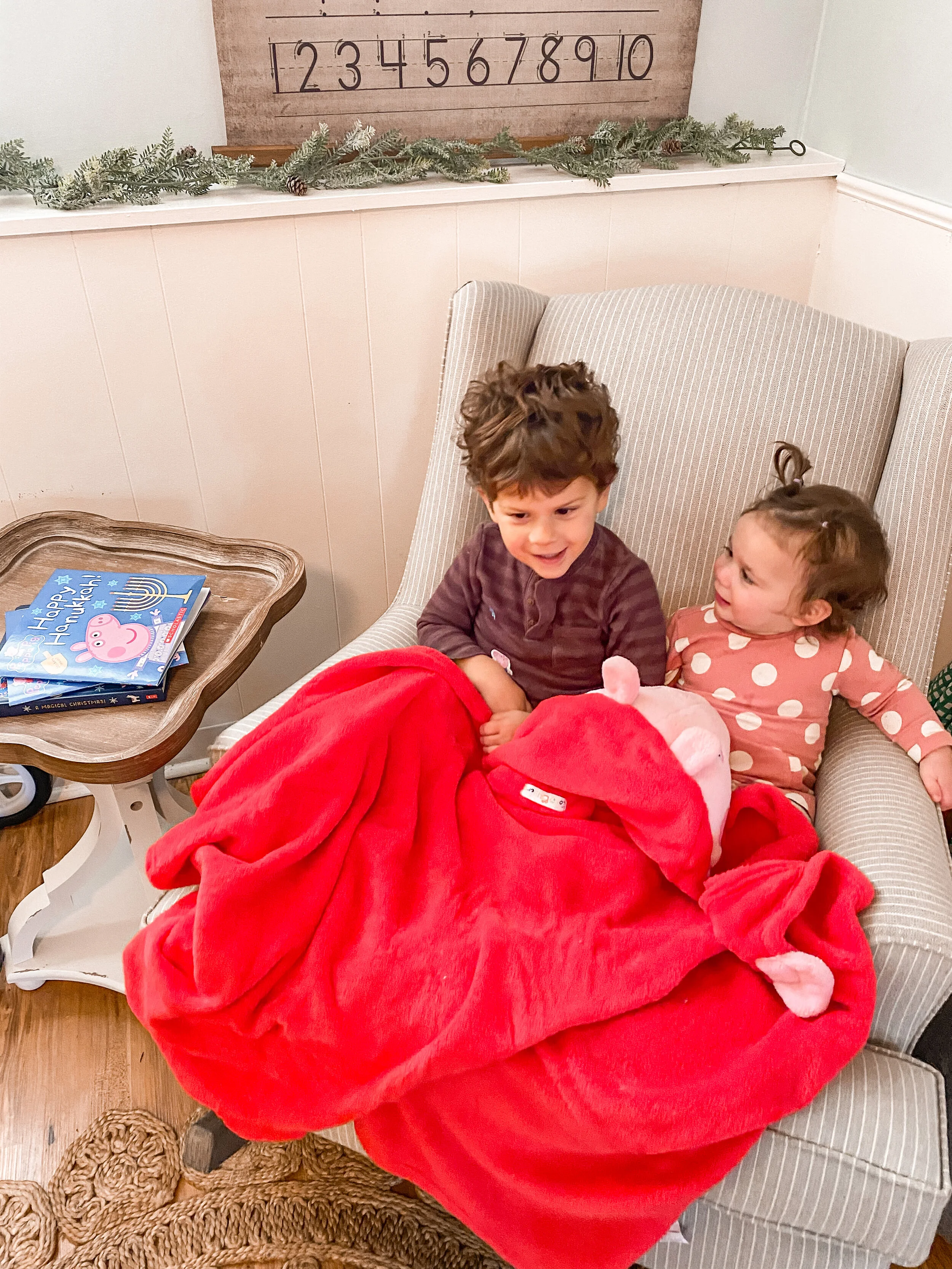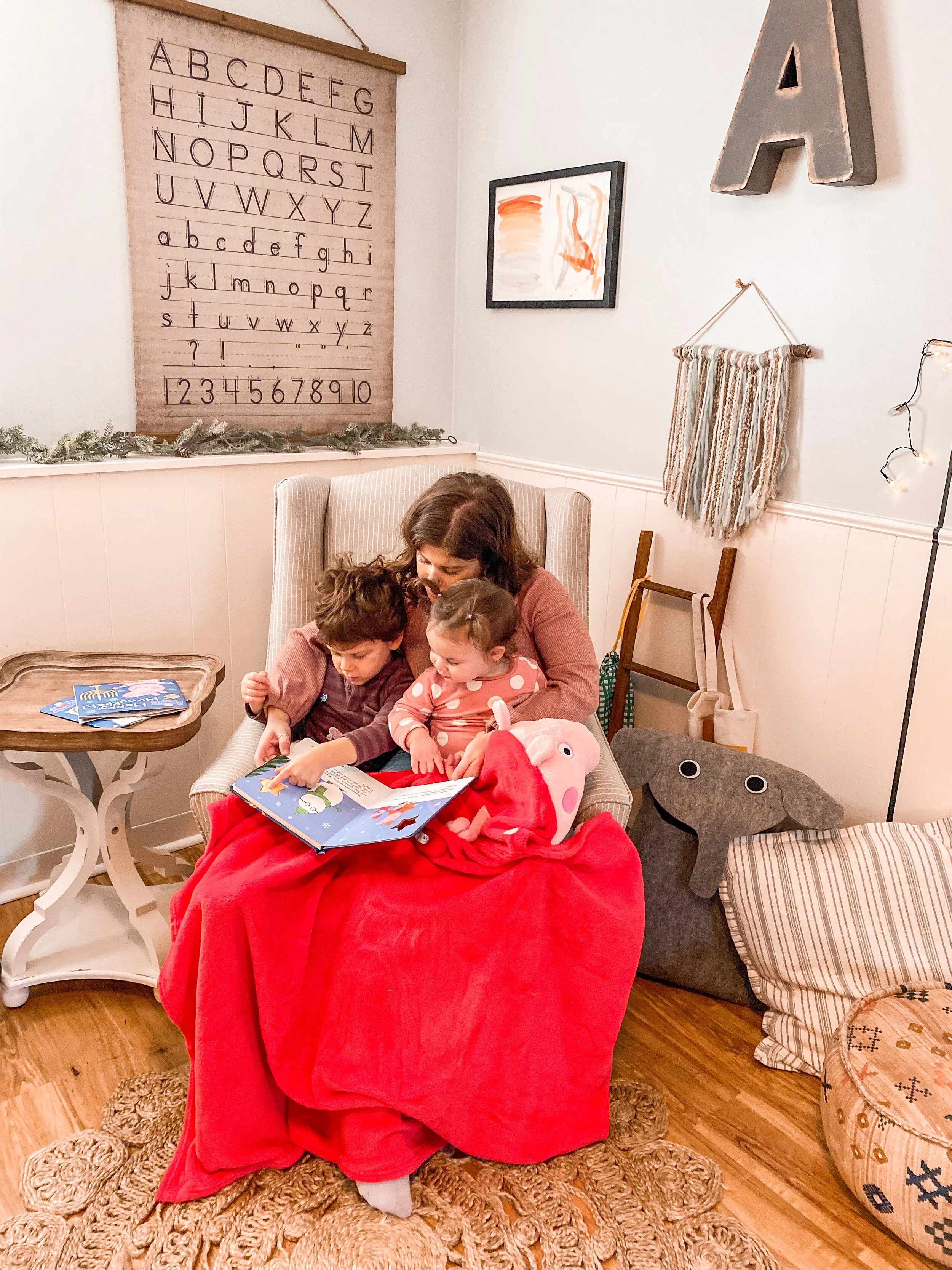 Our new reading corner has created lots of lasting memories which is exactly how I envisioned this space for our family. I love that we can easily grab some books and read together. The kids love to grab their Peppa Pig books and look at all the pictures together. The Comfy Critter blanket has been a hit in our house and the kids love to snuggle under it because it’s so soft, plus, the Peppa Pig head is fun to wear and play with too!