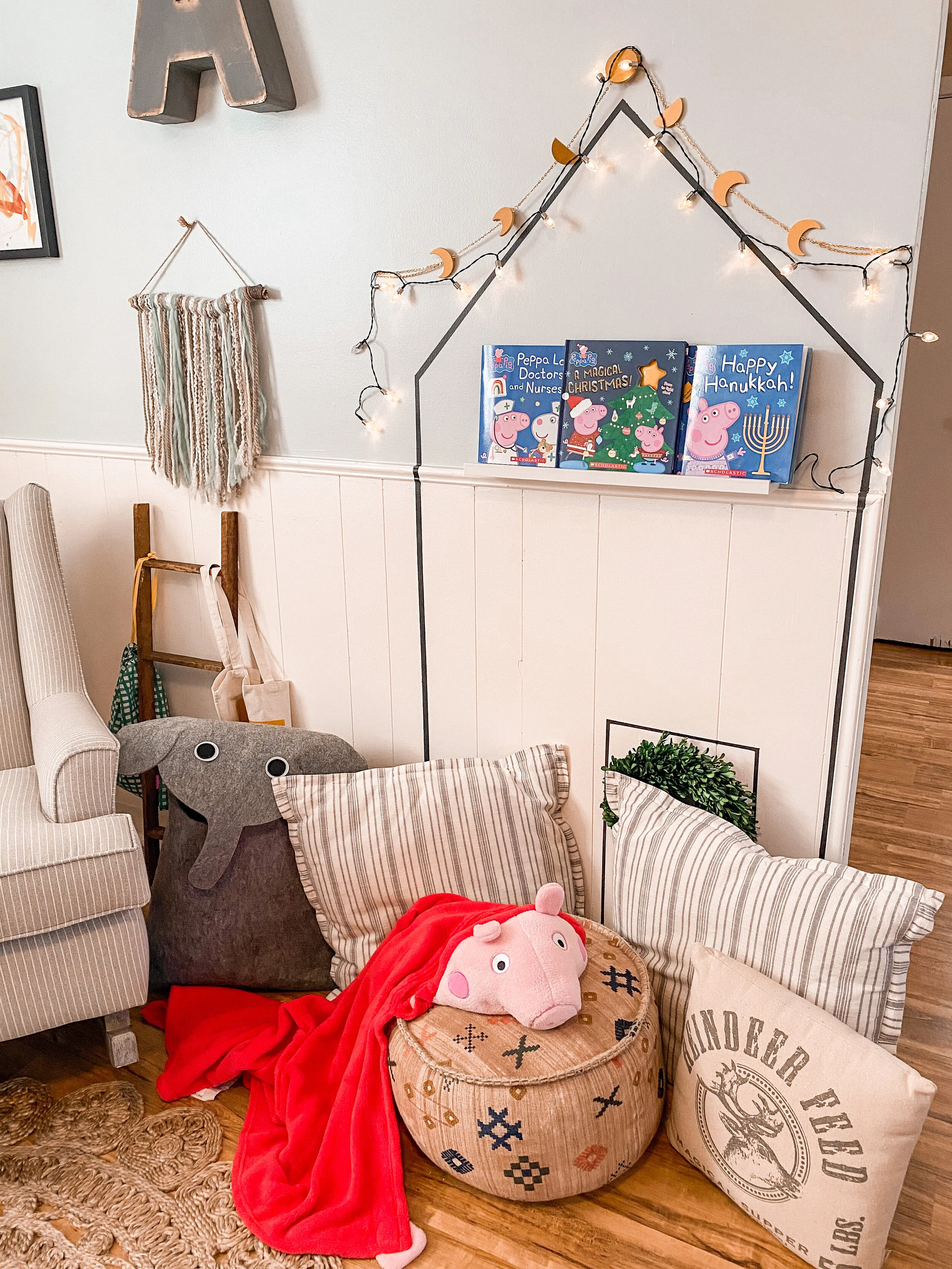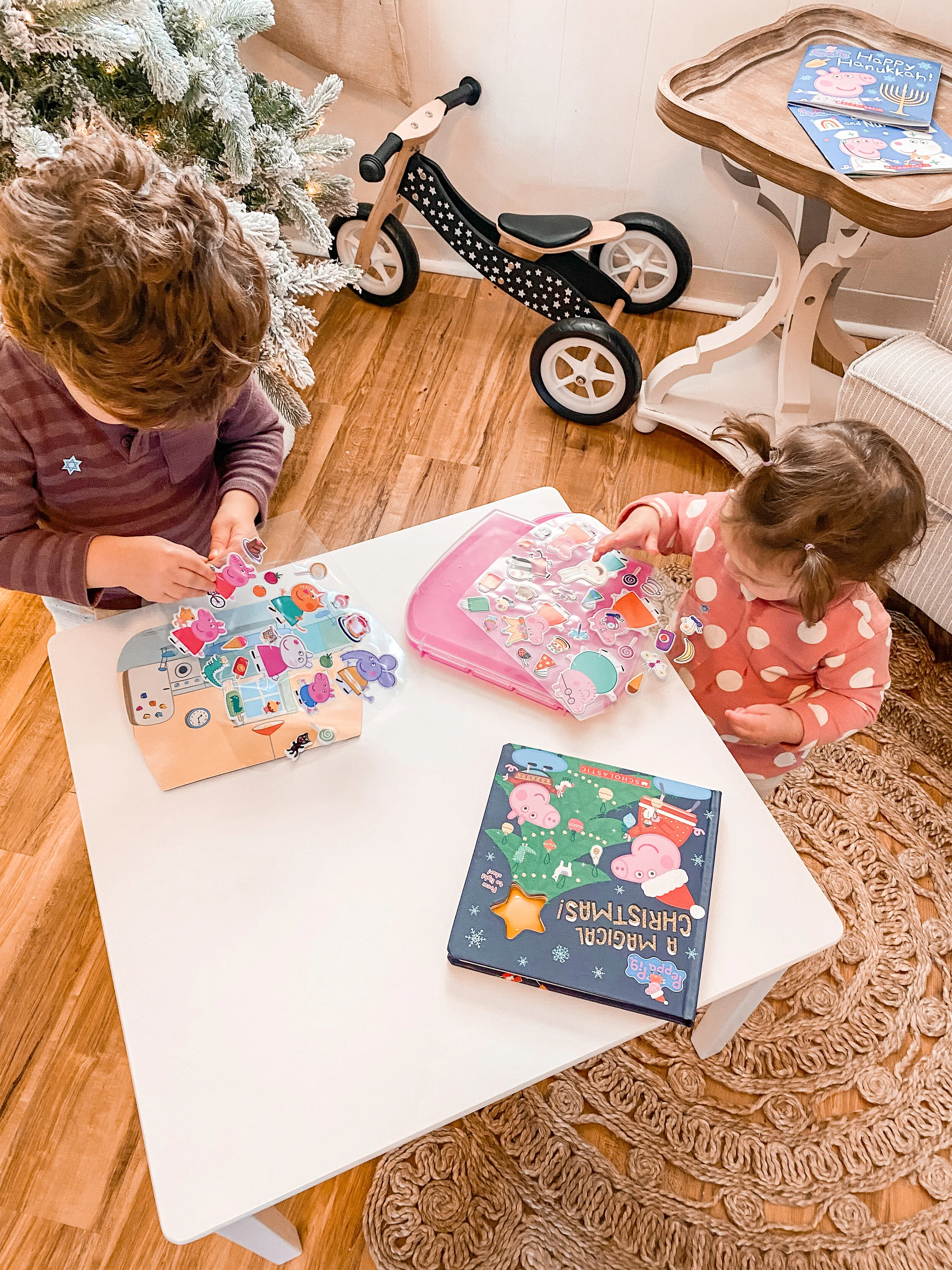 We love the holidays and decorating is one of our favorite parts. We always start a little earlier so we can enjoy it longer. We love having our Christmas trees up so we can read under the twinkly lights. It makes every activity all that more magical. Reading the Peppa Pig books by the Christmas trees is fun because the kids can read the books and then point to our trees too!