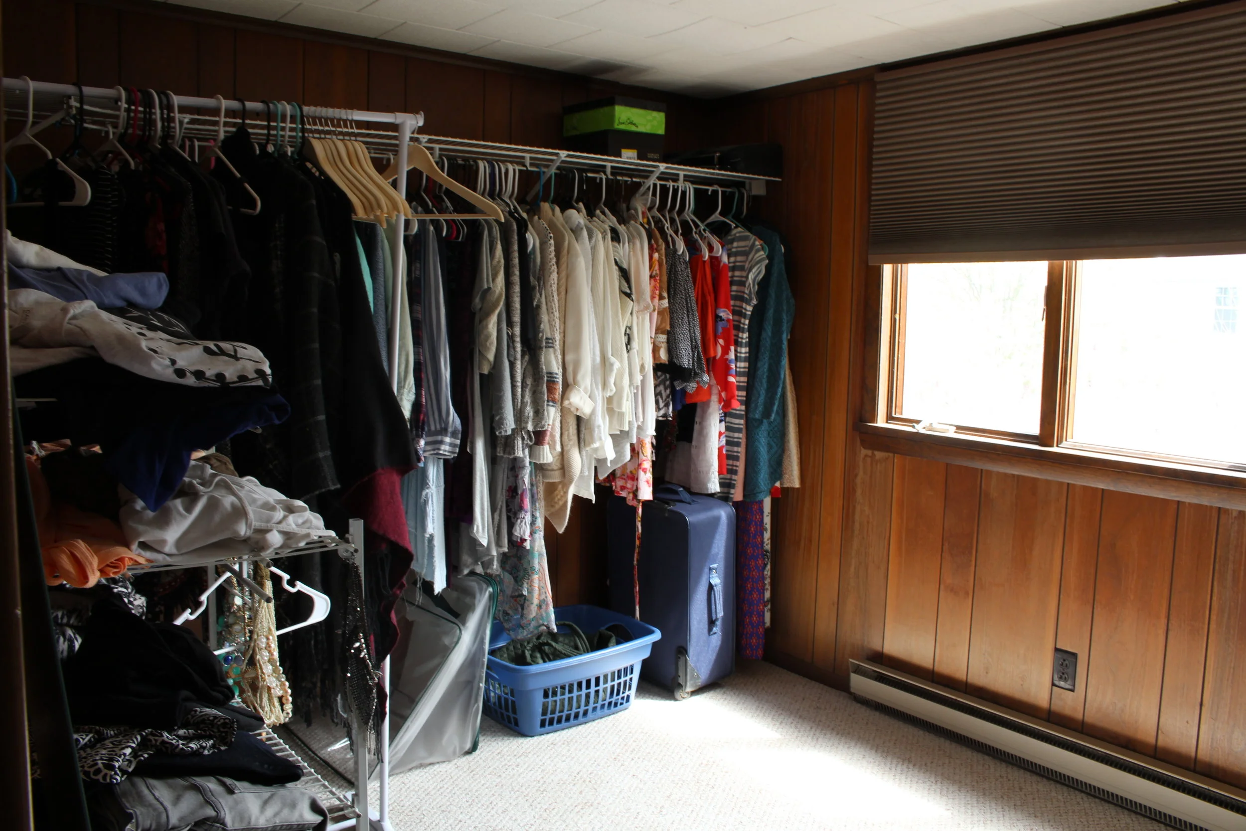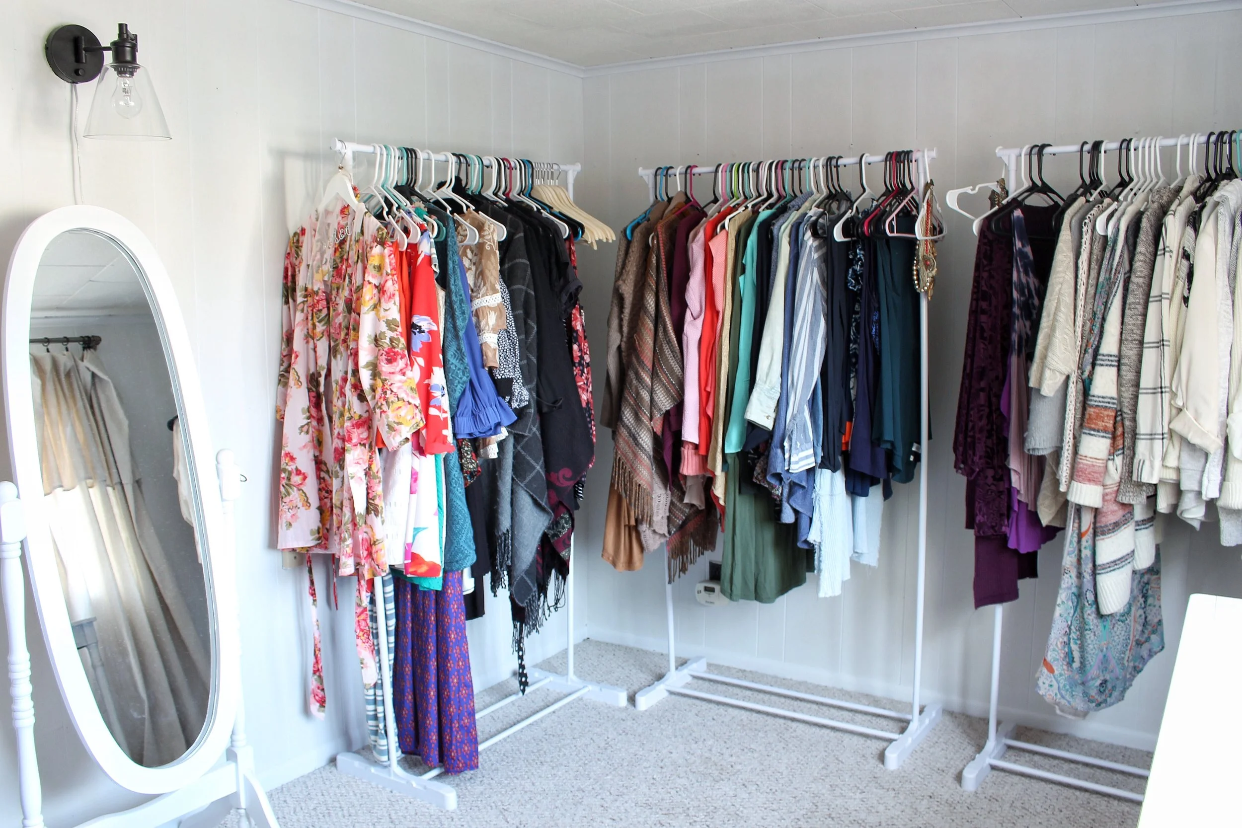 Instead of replacing the shelving, I used these garment racks. For only about $9 they are a steal & work great. They are light weight & I can move them wherever I want. They hold all of my clothes too.