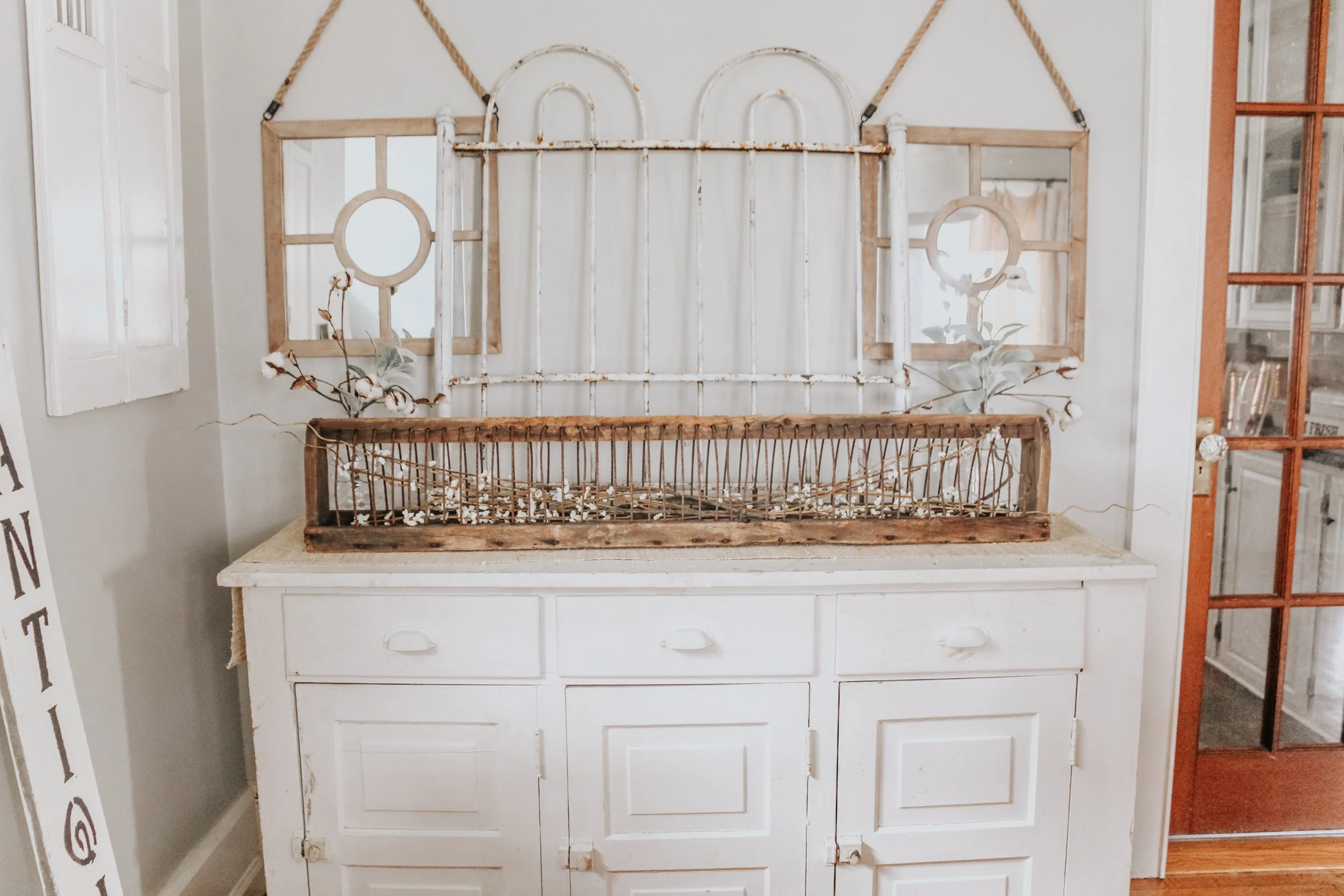 For the antique table, I kept it almost the same as what I did for Christmas with the mirrors and the gate, however I switched up the actual decor on the table. I added the old chicken feeder. I love the mix of brown from the feeder with all the white going on.